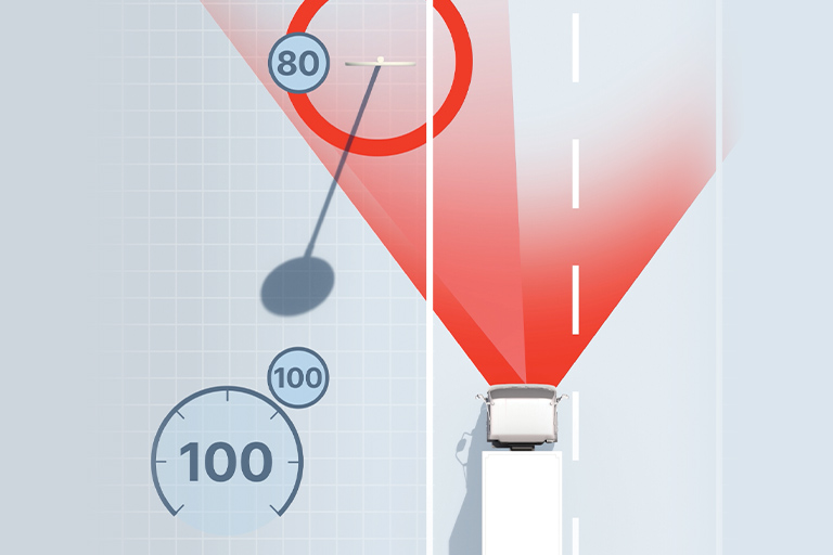 The ADAS’ camera recognises particular traffic signs, including speed limit signs, and informs the driver by displaying them on the dash instrument panel. AMT only.